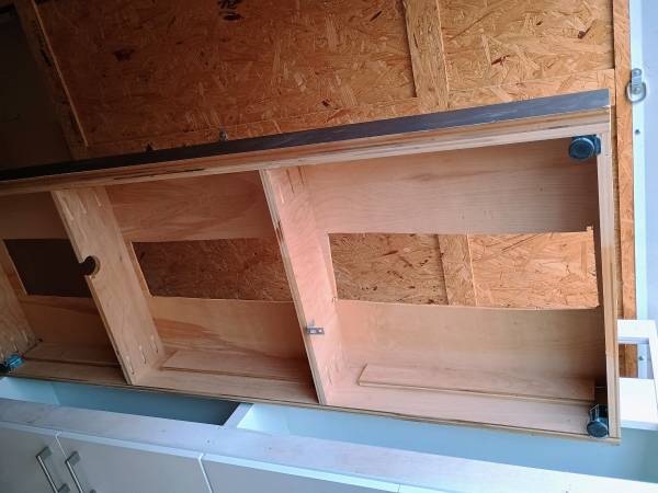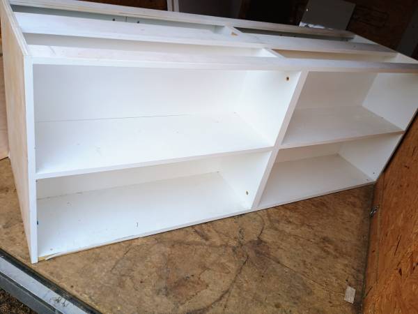 Cabinet with doors on one side and bookshelves on the other. Includes stand with adjustable feet.